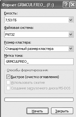 Если вы решили изменить тип файловой системы накопителя, то перед тем, как начать запись данных, нужно будет отформатировать накопитель. Для этого в окне, показанном на рис. 2.2, используется кнопка Форматировать. В результате откроется окно стандартного механизма форматирования диска (рис. 2.3).