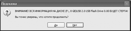 Теперь, когда flash-накопитель подготовлен, можно приступить к записи образа диска. Нажмите для этого кнопку Записать. Прежде чем начать процесс записи, программа предупредит вас о том, что все данные на flash-накопителе будут стерты (рис. 2.4), что уже совсем неактуально, если вы и так форматировали накопитель. Поэтому просто нажмите кнопку Да, после чего начнется процесс записи.