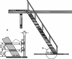 проступи. Толщина доски-косоура и проступей та же, что и в конструкции с тетивами.Марши лестницы должны иметь ширину не менее 90 см в частоте, т. е. от стены до ограждения. Высота ограждения равна 1 м. Оно может быть полностью деревянным (стойки из брусьев, перила из досок) или с металлическими стойками, которые крепятся сбоку ступеней.