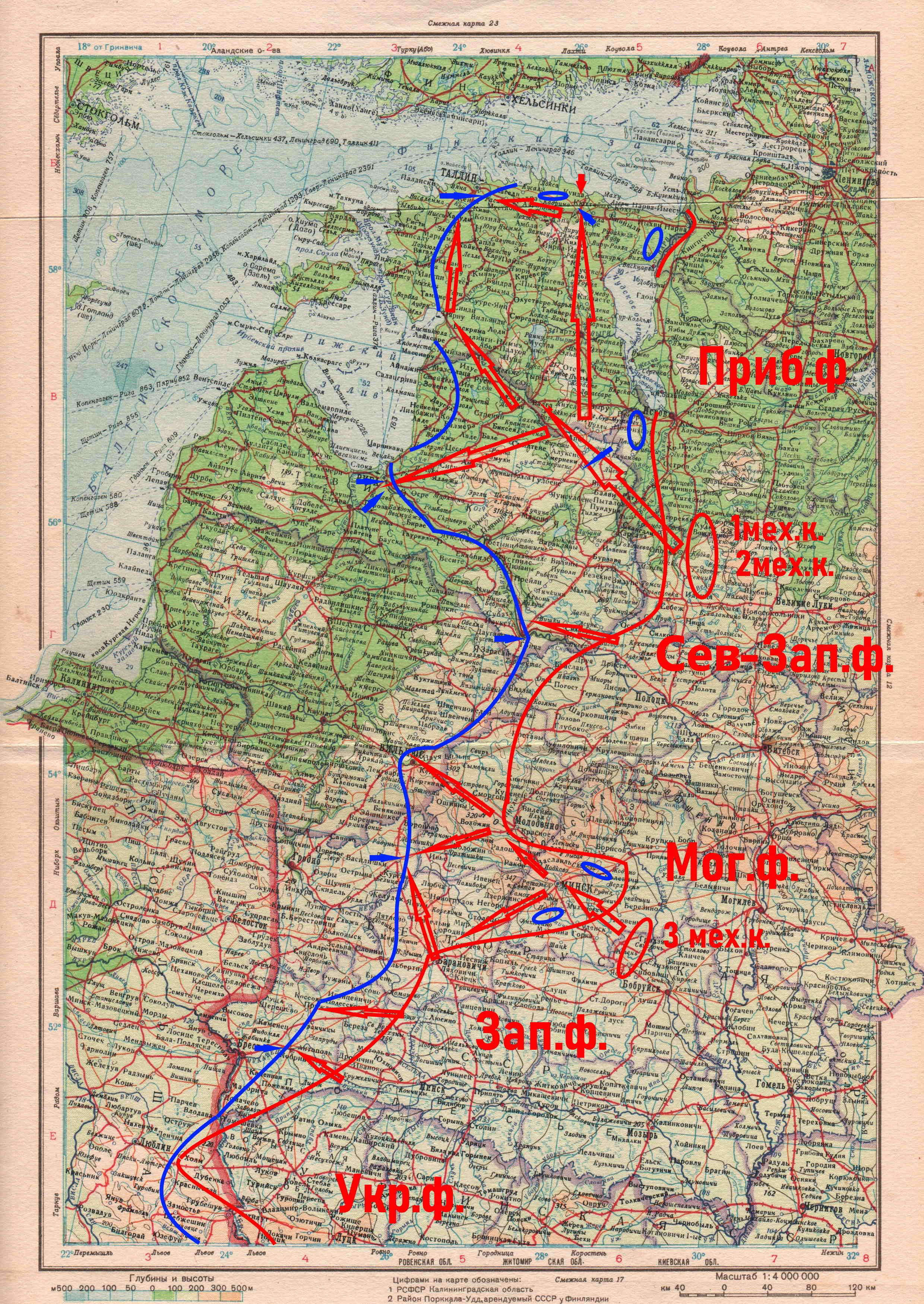 Первый Сталинский удар наносился на Прибалтийском фронте. Рокоссовский создавал у противника уверенность, что сосредотачивает силы в районе Гдов-Гостицы, и будет прорывать тот мощный оборонительный рубеж, которые немцы создали по берегу реки Нарва. Фон Лееб, командующий группы армий север был мастером создания оборонительных рубежей, именно поэтому Рокоссовский ударил совсем в другом месте. 1-й механизированный корпус Катукова, приданный Прибалтийскому фронту и 2-й механизированный корпус Ротмистрова, приданный Жукову скрытно сосредоточились в районе Опочки, там, где противник был уверен, что спрятать два корпуса просто невозможно.
