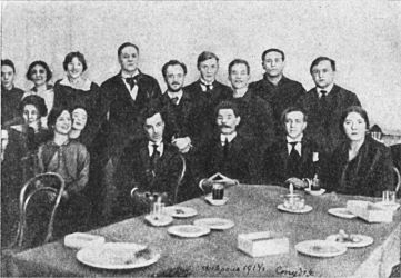 Сидят слева направо: М. Ф. Андреева, В. В. Соловьева, С. В. Гиацинтова, В. Л. Мчеделов, А. М. Горький, Е. Б. Вахтангов, Ф. В. Шевченко. Стоят слева направо: М. А. Чехов, А. И. Попова, С. Г. Бирман, Р. В. Болеславский, Л. А. Сулержицкий, И. Ф. Колин, Б. М. Сушкевич. 1914 г.