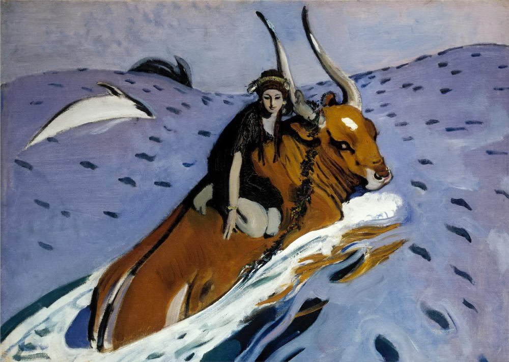 Похищение Европы Серова - не столько изображение мифа, сколько его отблеск, эмблема всего мира греческого искусства с его «высокой декоративностью, граничащей с пафосом», как говорил Серов в одном из писем. Часто присутствующий в работах художника момент игры с художественными воспоминаниями явлен и здесь: ритмично ныряющие дельфины напоминают, например, фрагмент росписи килика Диониса, выполненного греческим мастером VI века до н. э. Экзекием, да и бык напоминает изображения быков на древнегреческих сосудах (быть может, отчасти поэтому Серов первый из художников, изображавших миф о похищении Европы, отступил от первоисточника, рассказывающего о белом быке с золотыми рогами - коричневый бык напоминает о росписях краснофигурных