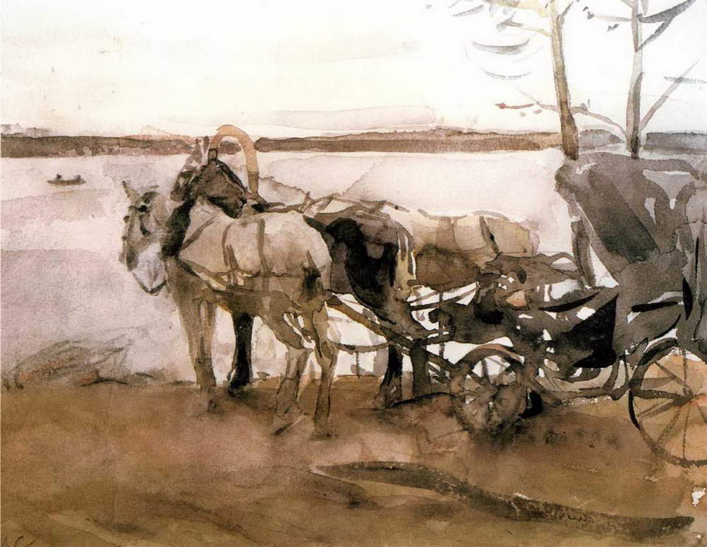 Серов как-то обмолвился, что хотел бы писать «одним движением кисти, как Костя Коровин». Портрет Коровина и написан таким образом, что заставляет вспомнить живопись самого Коровина. Он позировал Серову у себя в мастерской, среди раскрытых ящиков с красками и развешенных по стенам этюдов - художник в минуту отдыха. В портрете Левитана ничто не указывает на то, что изображен именно художник (хотя известно, что Левитан также позировал в своей мастерской). Серов здесь выбирает манеру письма, напоминающую портреты Крамского: сумрачный фон, коричневые тона, суховатая живопись. «Левитан был разочарованный человек, всегда грустный. Он жил как-то не совсем на земле, всегда поглощенный тайной поэзией русской природы», - пишет о своем друге Коровин. «Смуглое лицо с глубокими впадинами задумчивых, с тихой печалью глаз... Грусть его изящна. Каждый мазок на его этюде говорит о красоте души художника-поэта. И эта красивая тоска опьяняет вас, как аромат цветов», - вторит Коровину живописец Яков Минченков.