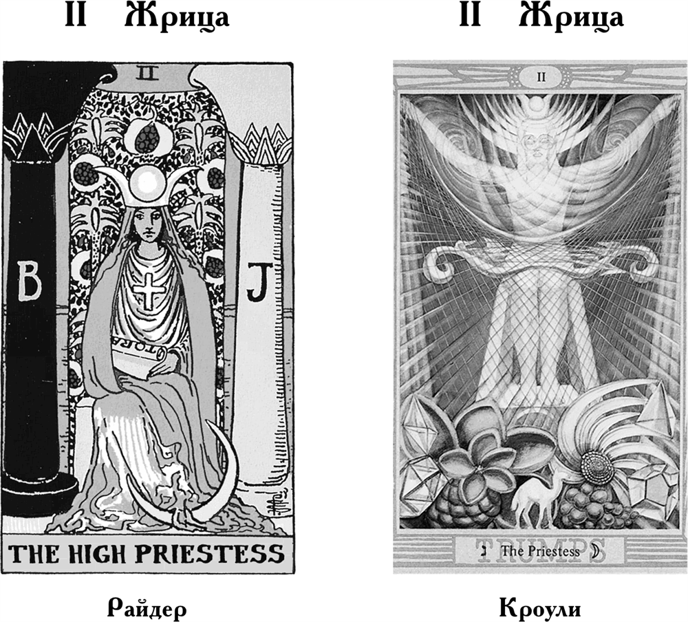правильно. В Таро Райдера это образ Марии, на коленях она держит свернутую Тору, символизирующую мудрость материнского чрева, гораздо более важную, чем преклонение перед догмой. В Таро Кроули изображена Изида из Саиса. Ее статуя была завешена вуалью, и каждый, кто осмеливался взглянуть на нее без инициации, приговаривался к смерти. Изида охраняет тайну жизни и смерти с помощью оружия, которое она держит на коленях. Таким образом эта карта предупреждает всех, кто решил проникнуть в глубины лунарной мудрости (бессознательного) без надлежащей подготовки, по-дилетантски, в насильственной или неуважительной манере, и даже тех, кто делает это в неподходящее время. Им угрожает безумие.Позиция 1