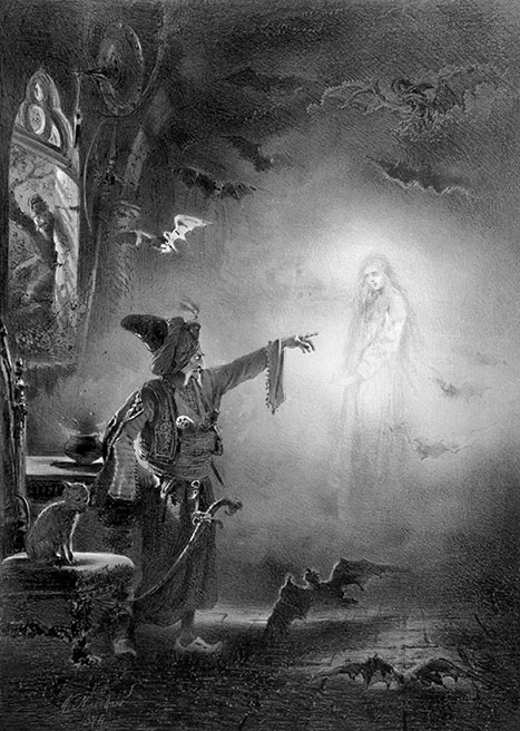 Колдун стал прохаживаться вокруг стола, знаки стали быстрее переменяться на стене, а нетопыри залетали сильнее вниз и вверх, взад и вперед. Голубой свет становился реже, реже и совсем как будто потухнул. И светлица осветилась уже тонким розовым светом. Казалось, с тихим звоном разливался чудный свет по всем углам, и вдруг пропал, и стала тьма. Слышался только шум, будто ветер в тихий час вечера наигрывал, кружась по водному зеркалу, нагибая еще ниже в воду серебряные ивы. И чудится пану Даниле, что в светлице блестит месяц, ходят звезды, неясно мелькает темно-синее небо, и холод ночного воздуха пахнул даже ему в лицо. И чудится пану Даниле (тут он стал щупать себя за усы, не спит ли), что уже не небо в светлице, а его собственная опочивальня: висят на стене его татарские и турецкие сабли; около стен полки, на полках домашняя посуда и утварь; на столе хлеб и соль; висит люлька… но вместо образов выглядывают страшные лица; на лежанке… но сгустившийся туман покрыл все, и стало опять темно. И опять с чудным звоном осветилась вся светлица розовым светом, и опять стоит колдун неподвижно в чудной чалме своей. Звуки стали сильнее и гуще, тонкий розовый свет становился ярче, и что-то белое, как будто облако, веяло посреди хаты; и чудится пану Даниле, что облако то не облако, что то стоит женщина; только из чего она: из воздуха, что ли, выткана? Отчего же она стоит и земли не трогает, и не опершись ни на что, и сквозь нее просвечивает розовый свет, и мелькают на стене знаки? Вот она как-то пошевелила прозрачною головою своею: тихо светятся ее бледно-голубые очи; волосы вьются и падают по плечам ее, будто светло-серый туман; губы бледно алеют, будто сквозь бело-прозрачное утреннее небо льется едва приметный алый свет зари; брови слабо темнеют… Ах! это Катерина! Тут почувствовал Данило, что члены у него оковались; он силился говорить, но губы шевелились без звука.