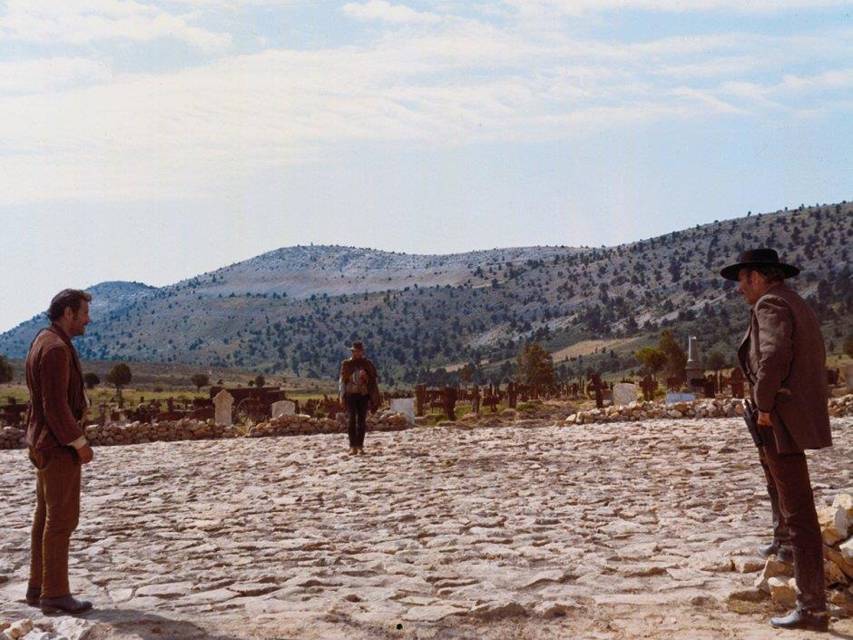 1 — Мексиканское противостояние — это кинематографический троп, описывающий ситуацию, когда несколько сторон находятся в конфронтации, угрожая друг другу оружием, и ни одна из них не может предпринять решительных действий, не подвергая себя риску быть атакованной другими участниками. Классическим примером является сцена из фильма «Хороший, плохой, злой», когда эти трое, Хороший, Плохой и Злой, становятся на бесплодной пашне, покрытой трещинами, и начинают тройную дуэль. Серджио Леоне знал, что делает, поэтому сцена получилась очень атмосферной.
