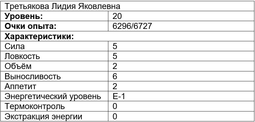 Она уже распределила очки характеристик и до сих пор переживает ускоренную рекомпозицию. За ночь у неё слегка уменьшилась грудь, уменьшились бёдра и исчезли бока, а также подтянулась кожа. Потеря объёмов связана с тем, что она единовременно сожгла значительную часть жировых запасов, но, если она продолжит питаться нормально, всё вернётся, но мышечной массой.