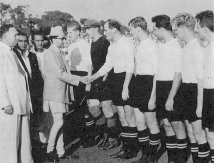 В ноябре 1955 года Хрущев с Булганиным отправились с дружественными визитами в Юго-Восточную Азию. Они вылетели сначала в Индию на шести самолетах Ил-14. В двух находились советские пищевые продукты, два везли самих Хрущева с Булганиным, а еще два взяли с собой в качестве подарка. Параллельным курсом по их маршруту отправились и мы. В Индии, правда, нам пересечься не удалось. Когда мы приземлились в Дели, Хрущев уже презентовал один из «Илов» Джавахарлалу Неру и отправился на Восток в Бирму к У Ну. Поэтому и мы в авральном порядке сыграли матч со сборной и полетели вслед за ними. Единственное, что запомнилась, так это встреча с королем Непала. Он как раз был в Индии и специально приехал на стадион на машине. Причем въезжал, когда мы выстроились на поле и заиграли гимны. На стадионе монарх остановил эскорт, вылез из машины, и стоял по стойке «смирно», пока играл «Союз нерушимый». После игры сделали нам индийские точки на лбу. Сфотографировались с нами и отправили в Бирму.