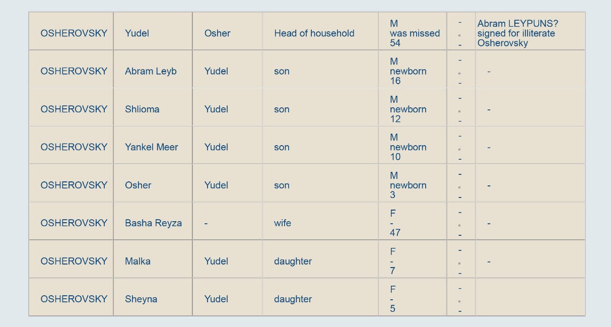 Абраму Лейбу Юделеву 16 лет. Его отцу Юделю Ошеру – 54, а матери Баше Рейзе – 47. и ввиду неграмотности (не умел писать по-русски?) Юдель доверил подписать лист Абраму Лейпунсу.