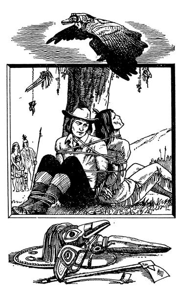 Танцевавшие застыли в ужасе, кое-кто упал на землю ниц. От леса к костру приближалось странное существо. Огромное, черное, оно шло прямо, как ходит человек, но там, где должны быть голова, руки, ноги, тело, — там всюду были перья ворона. На поляну вышел сам хозяин — дух Ворона и медленно приближался к перепуганным индейцам, считавшимся детьми Ворона. Дух Ворона подошел к костру совсем близко, когда в огне начали рваться патроны. Ужас охватил всех, и индейцы бросились с криками в чащу леса, а из костра вылетали все новые и новые выстрелы. Через мгновение никого не осталось на поляне. Дух Ворона подошел к пленникам и разрубил их путы. Филарет с ужасом отпрянул от чудища, а Вознесенский радостно схватил за воронью руку спасителя: