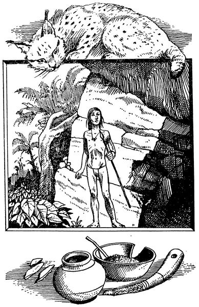 Зоркие глаза разглядели впереди какие-то серые точки, медленно движущиеся от реки в долину. Выбирая дорогу под прикрытием кустов, Второй ускорил бег. Вот он уже различает легкие переплетения рогов оленей. Упав на землю, мальчик ползет, прислушиваясь к собственному шороху, определяя направление ветра. Второй замер. Дальше нельзя ползти к оленьему стаду: ветер дует в ту сторону и олени почуют человека. Второй приподнялся, чтобы выбрать обходной путь, и чуть не вскрикнул от неожиданности. Слева, вдали, у самого берега реки, виднелось небольшое стадо слонов; справа спокойно жевавшие траву олени встрепенулись и помчались на мальчика. Он успел прицелиться и метнуть копье в одного оленя, тот упал, а все стадо на миг остановилось, затем сделало разворот и понеслось к горам. Только тогда увидел Второй, что стадо преследует рысь. Увлеченный погоней хищник не обратил внимания на человека, и Второй подошел к убитому оленю. Второй выполнил первое задание. Рука потянулась к древку копья, а до слуха долетело рычание. Не догнав оленье стадо, к мальчику и его добыче неслась рысь.