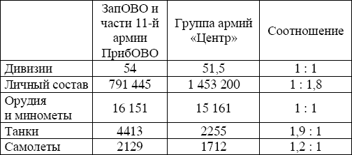 Группировка советских войск на Западном ТВД была достаточно мощной. Общее соотношение сил к утру 22 июня 1941 года представлено в таблице 17, по данным которой противник превосходил Красную Армию лишь по численности личного состава, ибо его войска были отмобилизованы.