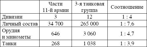 В таблице учтен личный состав сухопутных войск, авиации и погранвойск НКВД. Боевой и численный состав Вооруженных Сил СССР в период Великой Отечественной войны. Статистический сборник № 1. С. 16–18; средняя численность для войск 11-й армии рассчитана по: Военно-исторический журнал. 1988. № 7. С. 45; Коломиец М. 1941: бои в Прибалтике 22 июня — 10 июля 1941 года//Фронтовая иллюстрация. 2002. № 5. С. 10; Пограничные войска СССР в годы Второй мировой войны. С. 392; Мюллер-Гиллебранд Б. Указ. соч. Т. 3. С. 269–270; Das Deutsche Reich und der Zweite Weltkrieg. Bd. 4. S. 313.