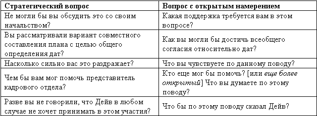 «Стратегические» вопросы представляют собой ловушку, в которую легко угодить, когда мы начинаем коучировать окружающих. Это объясняется тем, что мы знаем о необходимости избегать чрезмерной директивности и необходимости позволять окружающим давать собственные ответы, но мы все еще испытываем желание «помогать» или направлять своего собеседника на пути к решению. И поэтому мы задаем «стратегические» вопросы. Следующая таблица включает в себя примеры стратегических вопросов, а также вопросов с открытым намерением.