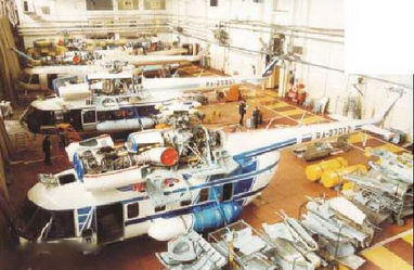 в сотнях и тысячах разных, непохожих друг на друга случаев. Занимаясь ремонтом вертолетов, эксплуатирующихся в самых различных условиях, они имеют колоссальный материал для сравнительного анализа и сравнительной диагностики состояния каждого узла, агрегата и вертолета в целом. Так, компания «СПАРК» является обладателем уникальной информационной базы, обобщающей все эти данные. На каждую машину, прошедшую ремонт, заведен паспорт. А если учесть, что многие вертолеты ремонтировались на ОАО «СПАРК» неоднократно, то переоценить эту информацию просто невозможно. Кроме того, никогда производитель не будет с такой любовью и тщательностью ремонтировать технику, как это делает специализированное авиаремонтное предприятие. Задача производителя – за счет модернизации расширить сферу использования вертолетов, а ремонтника – совместно с разработчиком и отраслевыми НИИ обеспечить долгую эксплуатацию этих вертолетов.Ангар для переоборудования и доводки вертолетов