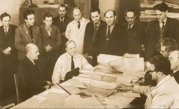 Обсуждение варианта конструкции вертолета В-12. В центре за столом — М. Л. Миль, стоит крайний справа — М. Н. Тищенко