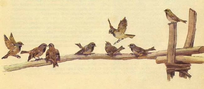 Наконец самые озорные из них — воробьи — решили запеть. Не беда, что на воле холодно, сыро. Расчирикались воробьи за деревенской околицей, прямо удержу нет. Крылышки распускают, хвостики растопырили, наскакивают друг на друга, кричат, шумят, из кожи лезут вон, так стараются.