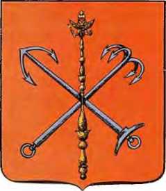 Старинный герб Петербурга. Красное поле щита напоминает о кровопролитных сражениях на берегах Невы; якоря двух видов объясняют, что город морской и речной порт; скипетр означает, что город столица России.