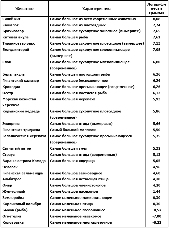 Но холоднокровные позвоночные часто бывают меньше любого теплокровного млекопитающего или птицы; ведь у таких животных температура тела может понижаться при понижении температуры окружающей среды и интенсивность обмена снижается до нужного уровня. Следовательно, самых мелких позвоночных следует искать среди рыб. У Филиппинских островов водится рыба из группы бычков; длина тела этой рыбки во взрослом состоянии всего 1 сантиметр. Ее вес вряд ли превышает 0,3 грамма, что дает отрицательный логарифм (–0,52).