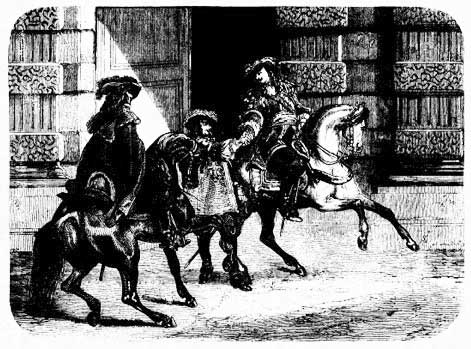Беглецы сели в седла на глазах у капитана мушкетеров, который поддержал стремя Портосу. Он провожал взглядом своих удаляющихся друзей, пока они не скрылись из виду.