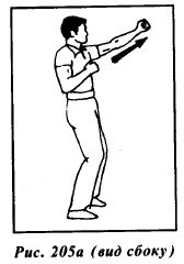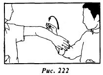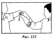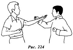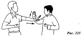 В результате, принято исходное положение для продолжения упражнения, которое начинается толчком левой руки со стороны партнера находящегося слева. На это партнер справа отвечает блокирующим движением правой рукой, надавливая сверху вниз (рис.225), а затем моментально атакует, нанося прямой удар кулаком.