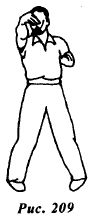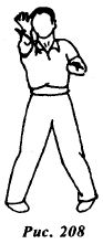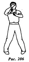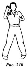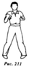 Не останавливаясь, он выпрямляет левую руку вперед, нанося удар кулаком. Почувствовав изменение в структуре защиты оппонента, партнер справа поднимает правую руку вверх в положение Бон Сау, блокируя атаку (рис.218).