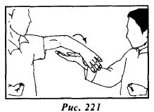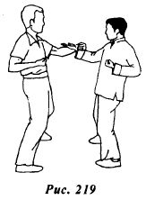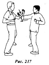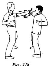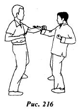 Партнер справа выполняет атакующее движение основанием ладони, выпрямляя правую руку вперед. Партнер слева моментально реагирует на это действие, опуская левую руку вниз и нейтрализуя атаку (рис.217).