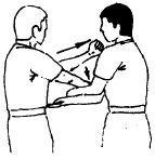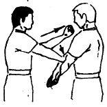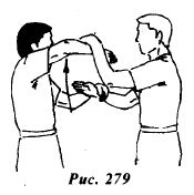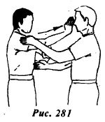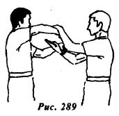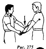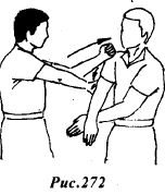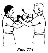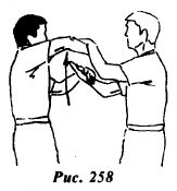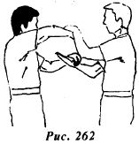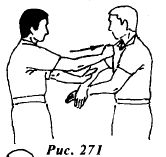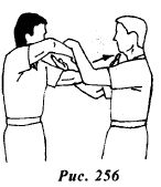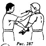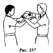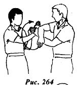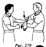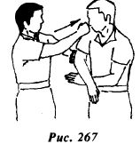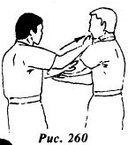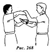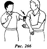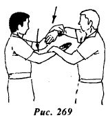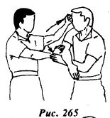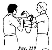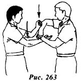 Не останавливаясь, опустите левую руку вниз, прижимая левой ладонью правое плечо оппонента вниз (рис.266).