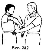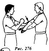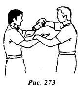 Не останавливаясь, поднимите левую руку вверх по дугообразной траектории и захватите предплечье левой руки партнера возле локтевого сустава (рис.295).