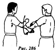 Далее, поворачиваясь налево на 45°, опустите левую руку круговым движением вниз, накрывая обе руки партнера и, выполните движение Ган Сау (рис.286).
