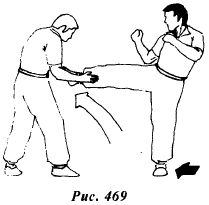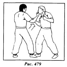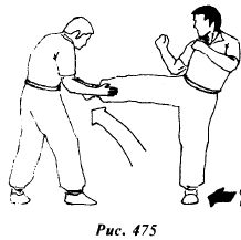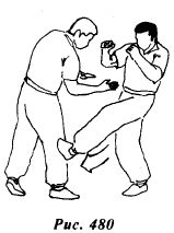 Вариантом дня окончания комбинации может быть прямой удар внутренней частью левой стопы в коленный сустав впередистоящей ноги противника (рис.480).