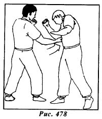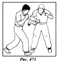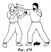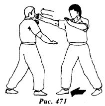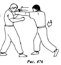 Быстро сделайте шаг левой ногой вперед вправо, уходя с линии атаки. Одновременно нейтрализуйте удар движением Тан Сау правой рукой, при этом левую руку вытяните вперед, упираясь ладонью в предплечье правой руки противника (рис.482).