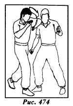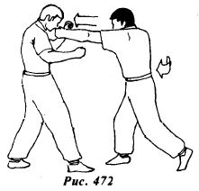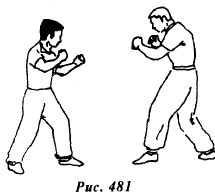 Из исходной позиции (рис.481) противник, делая шаг левой ногой вперед, сокращает дистанцию и атакует, нанося прямой удар правым кулаком в голову.