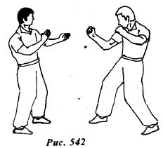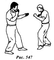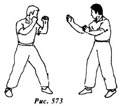 Из исходной позиции (рис.573) противник делает шаг левой ногой вперед, сокращая дистанцию и наносит прямой удар левым кулаком в голову.