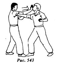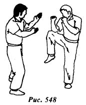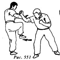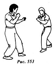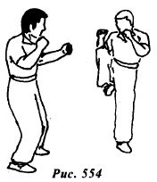 Из исходной позиции (рис.553) противник атакует боковым ударом правой стопой в среднюю или нижнюю часть туловища (рис.554).