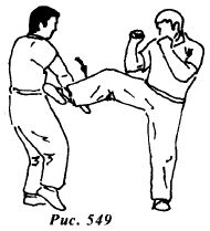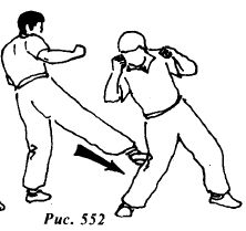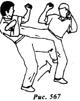 Перенесите вес тела на правую ногу и быстро нанесите прямой восходящий удар подъемом левой стопы в подколенный сгиб опорной ноги противника (рис.567).