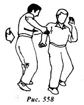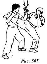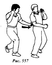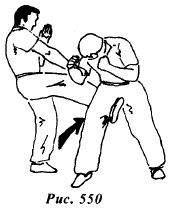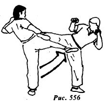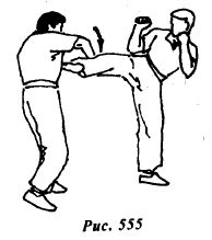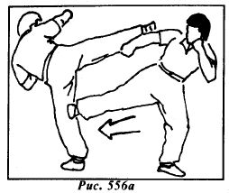 Используя ситуацию, контратакуйте прямым восходящим ударом правой ногой в пах (рис.556) или боковым ударом правой ногой в подколенный сгиб левой опорной ноги противника (рис.556а).
