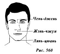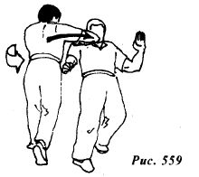 Опустите ногу на землю и продолжите контратаку восходящим ударом левым кулаком в область правой почки (рис.557), а затем, поворачиваясь налево, нанесите завершающий удар правым локтем в голову (рис.558,559) поражая точки Чень-Джень. Жэнь-Чжун или Лянь-Цюань (рис.560).