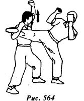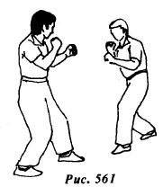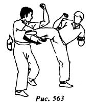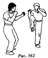 Из исходной позиции (рис.561) противник атакует боковым ударом правой ногой в среднюю или нижнюю часть туловища (рис.562).