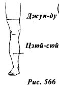 Резко опуская левую руку вниз, нанесите нисходящий удар локтем по внешней части бедра правой ноги противника (рис.565) в область точки Джун Ду (рис.566).