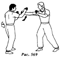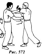 Надавливая левой ладонью на левое плечо противника, опустите его руку вниз. Одновременно контратакуйте, нанося прямой удар правым кулаком Ят Чи Куен в область плавающих ребер (рис.572).