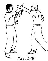 атаку, нанося прямой удар левым кулаком в голову. Для защиты снова воспользуйтесь правой рукой, выполняя блок Биу Сау (рис.570).Далее, перехватывая инициативу, вытяните левую руку вперед, выполняя вновь движение Биу Сау (рис.571).