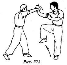 Из исходной позиции (рис.583) противник начинает атаку, нанося прямой восходящий удар правой ногой в пах (рис.584).