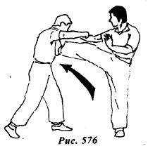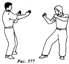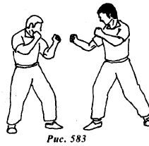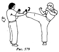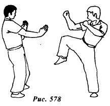 Из исходной позиции (рис.588) противник начинает атаку, нанося круговой удар правой ногой по внешней части бедра впередистоящей ноги.