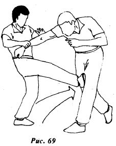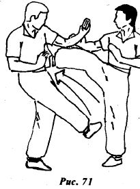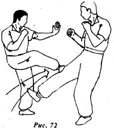 В реальном поединке прямой удар ногой используется одновременно с защитными или атакующими действиями руками (рис.69,70, 71).
