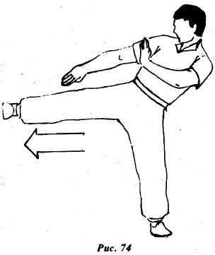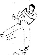 Разворачивая левую стопу влево и поворачиваясь туловищем налево, нанесите боковой удар, распрямляя ногу в коленном суставе. При этом правую руку опустите вниз, а левую - поднимите вверх (рис.78).