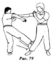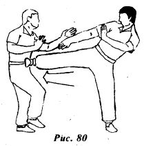Обычно боковой удар стопой используется одновременно с какой-либо защитной техникой рук (рис.79.80).