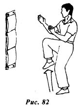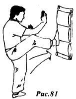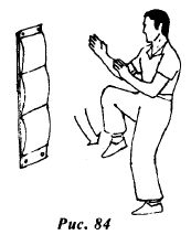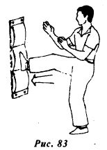 Приняв правостороннюю боевую переднюю позицию, поднимите правую ногу согнутую в колене вверх (рис.82), а затем быстро распрямите ее, нанося прямой удар в мешок (рис.83).