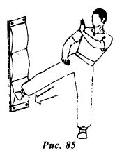 Аналогичное упражнение выполняется и для отработки бокового удара стопой. Целесообразно объединять два упражнения. В этом случае после нанесения прямого удара, нога не опускается на землю, а сгибается в коленном суставе (рис.84), и затем снова распрямляется вперед, нанося уже боковой удар стопой (рис.85).