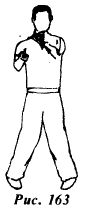 Выпрямите левую руку в локтевом суставе, нанося тычковый удар пальцами вперед. При этом правую кисть сожмите в кулак и отведите назад к груди (рис.163).